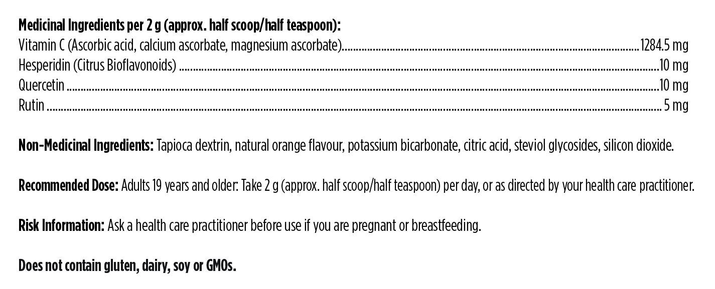 This delicious, effervescent, orange-flavoured powder easily provides therapeutic dosing of vitamin C and bioflavonoids. Potassium bicarbonate is included in this formula as a buffering agent and to give it “fizz.” Also included are quercetin, hesperidin and rutin, which are all natural bioflavonoids found in citrus fruits.