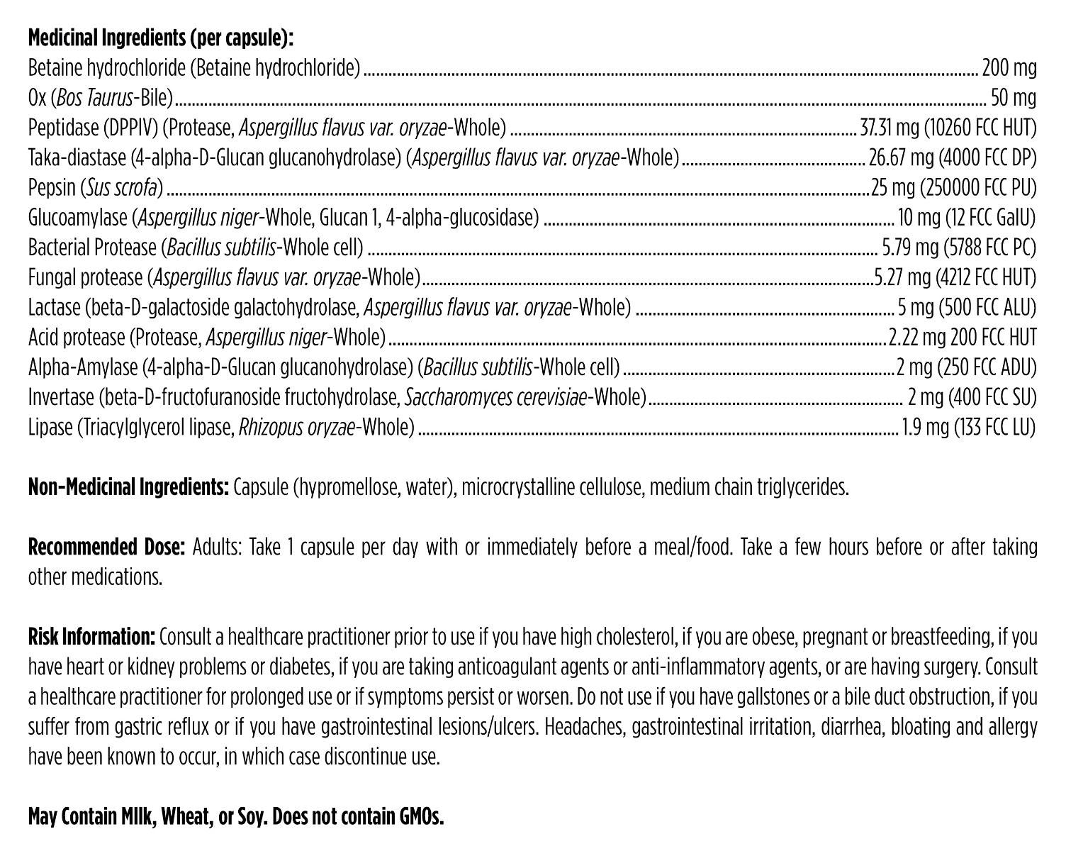 Proprietary blend of digestive enzymes: The pancreas produces enzymes that are required for digestion and absorption of food. Enzymes secreted by the pancreas include lipases, proteases, and amylases, which aid in the breakdown of fats, proteins, and starches, respectively. This blend includes pepsin and proteases to break down protein and amylases, respectively, and glucoamylase to break down carbohydrates, lactase to digest lactose, and lipase to digest fats and fat-soluble vitamins.
