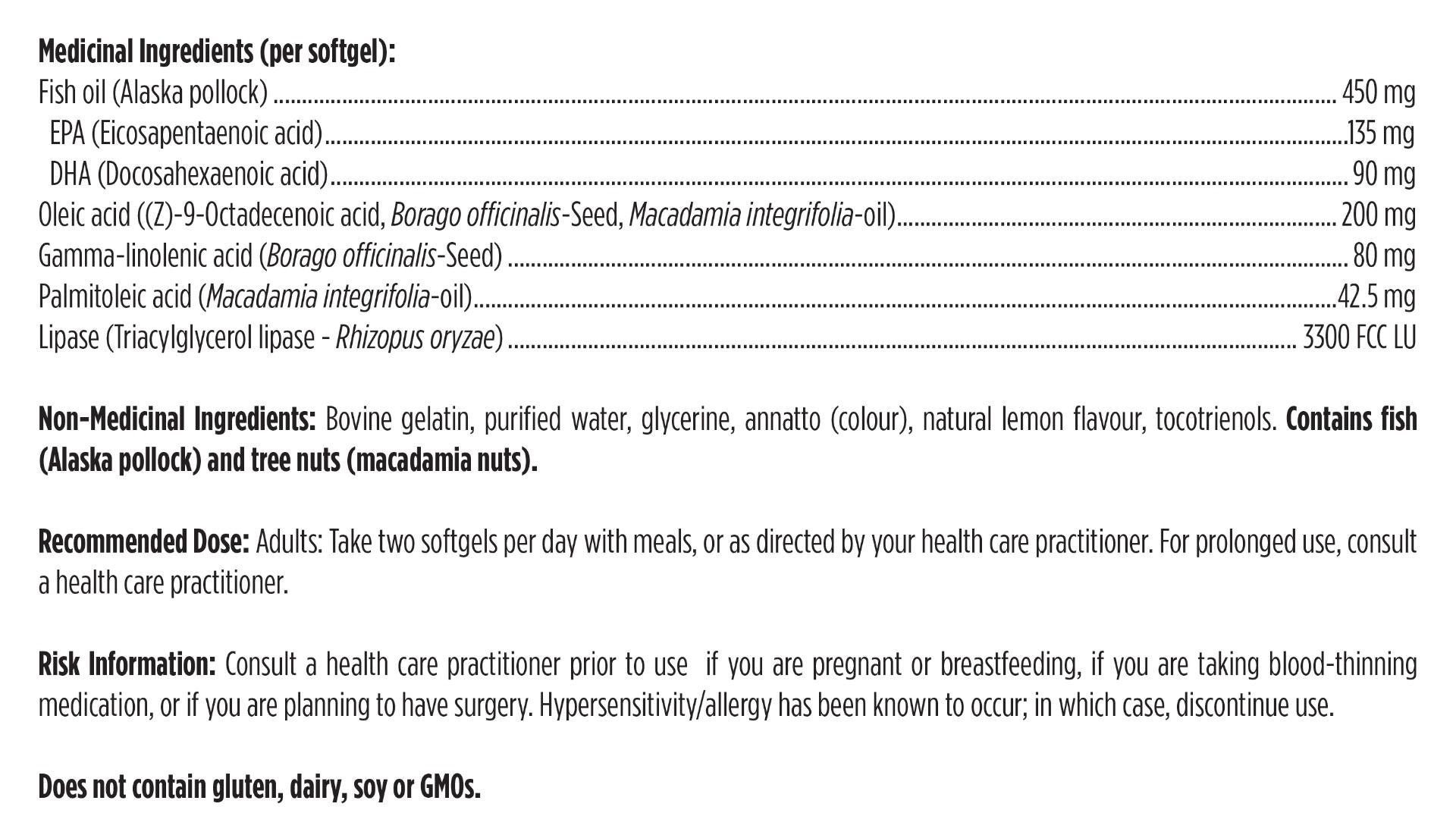 This unique omega 3-6-7-9-formula contains a blend of wild deep-sea sourced fish oils containing the omega-3 fats (EPA/DHA) in the TruTG form, the most important omega-6 fat (GLA from borage oil), the omega-7 fat palmitoleic acid and omega-9 fat oleic acid from certified virgin organic macadamia nut oil. Only Designs for Health fish oil products carry the TruTG seal, which means they are delivered in the form found in nature and are of superior TG potency. The TruTG seal guarantees a minimum 90% triglyceride-bound (TG) omega-3 fish oils, a level that is 40%-50% higher than the industry standard for most TG fish oil concentrate products.