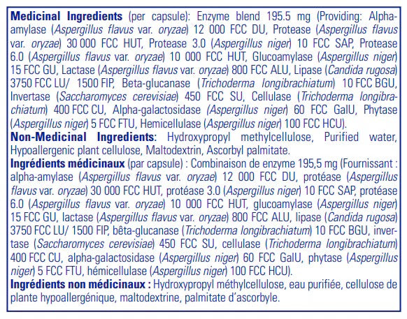 Digestive Enzymes Ultra contains a mixture of vegetarian enzymes to promote optimal nutrient digestion. Proteases included in this formula are active across a wide pH range. They facilitate the normal breakdown of proteins and di- and tri-peptides. Lipase promotes lipid breakdown, while amylase and glucoamylase stimulate polysaccharide breakdown of starch and glycogen. Invertase and lactase enhance digestion of carbohydrate disaccharides, including the dairy sugar lactose. This formula also offers cellulase, hemicellulase, beta-glucanase and phytase. These enzymes break down cell wall components and phytic acid, improving nutrient bioavailability of fibre-containing foods. Additionally, alphagalactosidase promotes the breakdown of certain complex carbohydrates, such as raffinose and stachyose, found in some legumes, vegetables and grains before they can be metabolized by gas-producing bacteria in the colon.