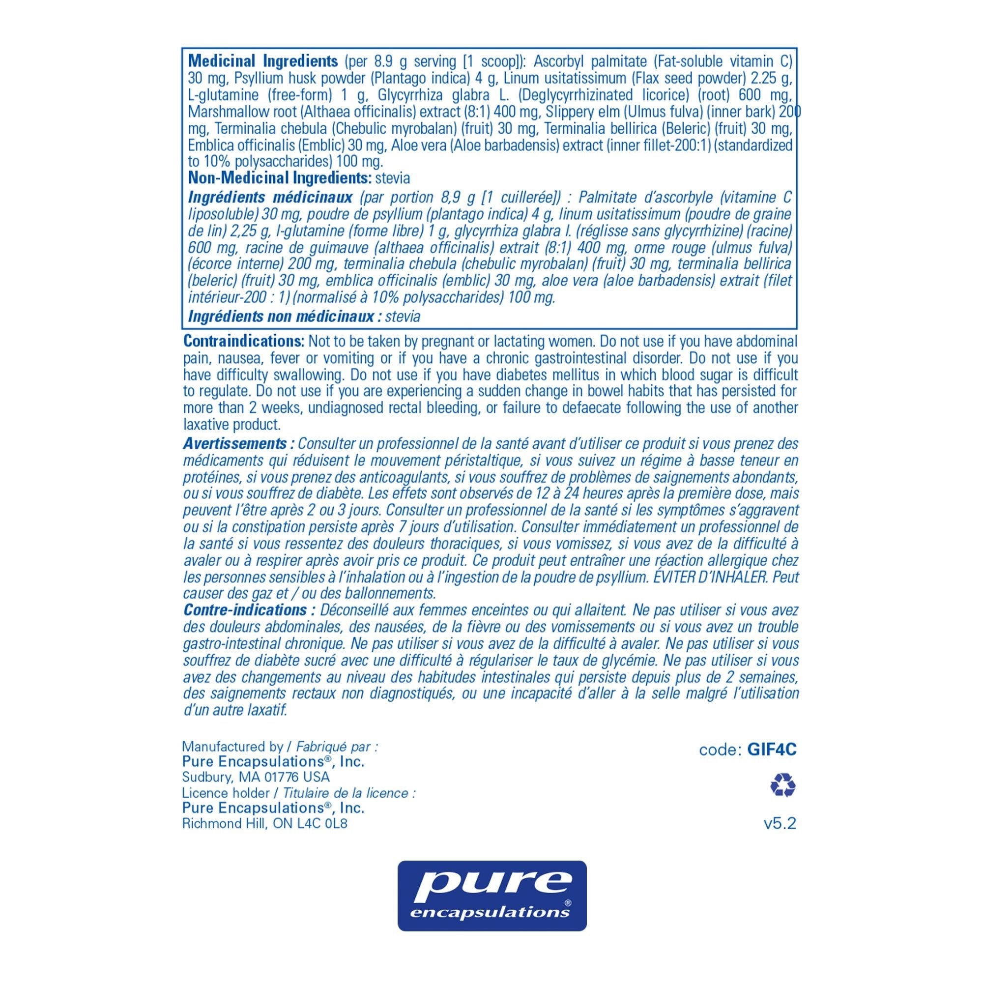 Blend of high-impact fibre, herbs and nutrientsG.I. Fortify provides comprehensive relief for constipation. Psyllium, or Plantago ovata, is a valued source of soluble fibre. Soluble fibre absorbs water to form a gel, increasing stool volume when taken with appropriate amounts of water to promote larger and softer stools for healthy bowel movements. As the bulk moves through the intestine, it also aids in collecting and eliminating other waste and toxins from the intestinal walls. Soluble fibre is fermented slowly in the colon by intestinal microflora, which further contributes to increased fecal mass. The fermentation process produces short chain fatty acids (SCFAs), which offer beneficial effects for healthy colon cell function as they are important energy sources for the colon and may regulate colonic transit. Furthermore, SCFAs maintain an acidic intestinal environment, providing optimal conditions for a healthy intestinal microflora. Flax is an additional source of soluble fibre, and also contains fatty acids and lignans. G.I. Fortify also contains the amino acid l-Glutamine, plus a combination of deglycyrrhizinated licorice (DGL), aloe, slippery elm and marshmallow root. Additionally, it includes an equal proportion of three fruit extracts, Terminalia chebula, Terminalia bellirica and Emblica officinalis, which have a long traditional history of use in the Ayurvedic medicine Triphala, literally translated as “three fruits.
